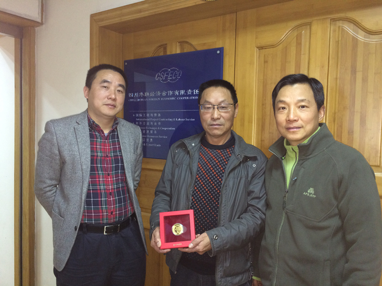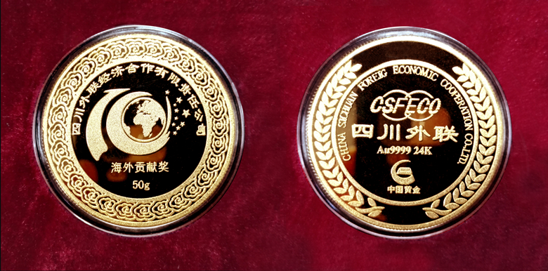 2016年猴年新春伊始,四川外聯經濟合作有限責任公司對首位陪伴公司十年海外發(fā)展的員工黃成良先生給予獎勵,授予他一枚“十年海外貢獻獎”50克純金金幣獎章!